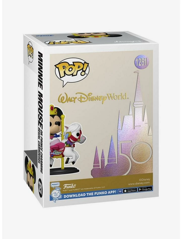 Celebrate 50 years of magic at the Walt Disney World Resort by commemorating one of its beloved theme park attractions! Pop! Minnie Mouse on Prince Charming Regal Carrousel is ready to take a spin through Fantasyland as she wears her royal princess outfit. Join Pop! Minnie for a whimsical ride as she gallops into your Disney Parks collection.Β