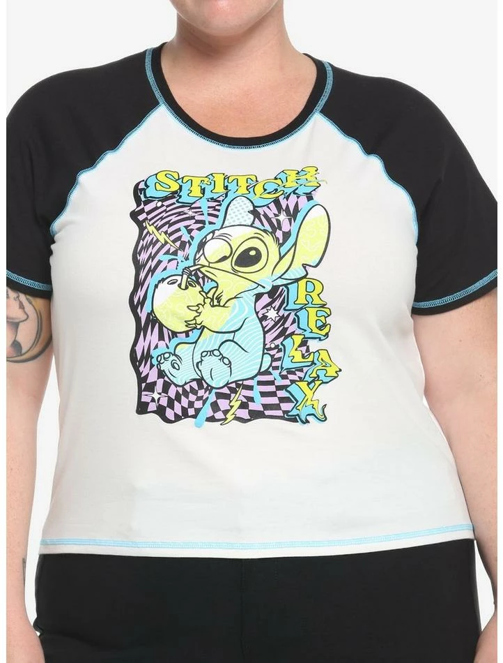 Keep your outfit as fun as your favorite extraterrestrial with this raglan baby tee! Stitch is here to remind you to relax while adding something fresh to your wardrobe. He’s depicted in bold, psychedelic neons and sipping on some coconut juice. Features a warped checkerboard background, electric blue contrast stitching, plus “Stitch” and “Relax” printed around him in neon warped lettering.