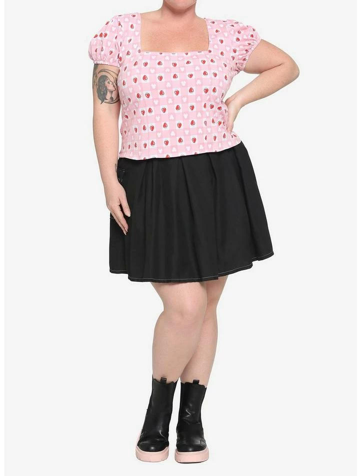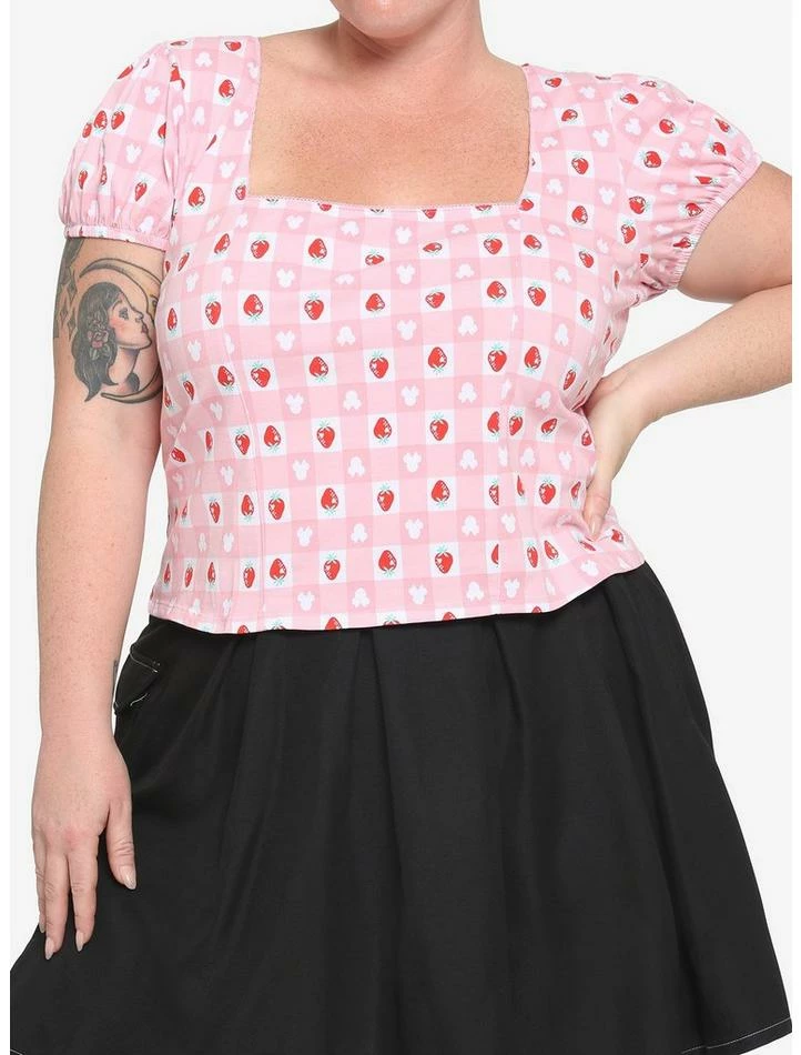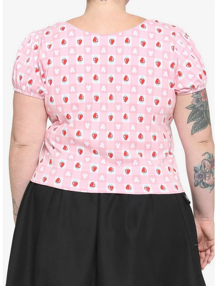 Going berry picking with your sweetheart? Let Minnie Mouse help you dress for the occasion! This gingham top is perfectly sweet for any date, featuring a square neckline and puff sleeves, plus princess seams running down the length of the top. The pink gingham pattern has tosses of strawberries and Minnie Mouse heads throughout!