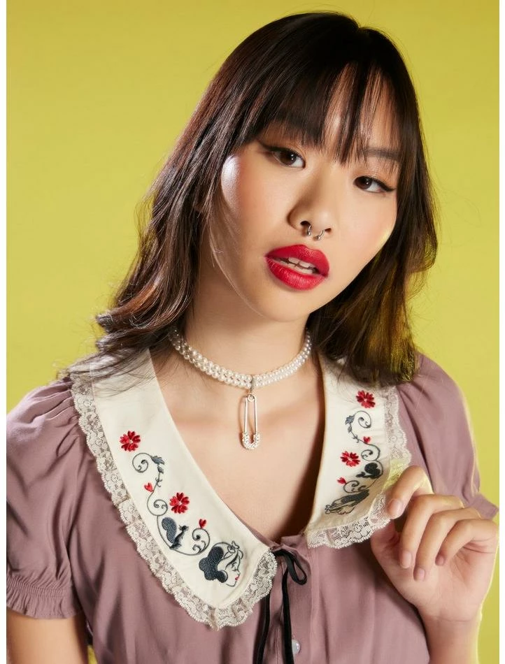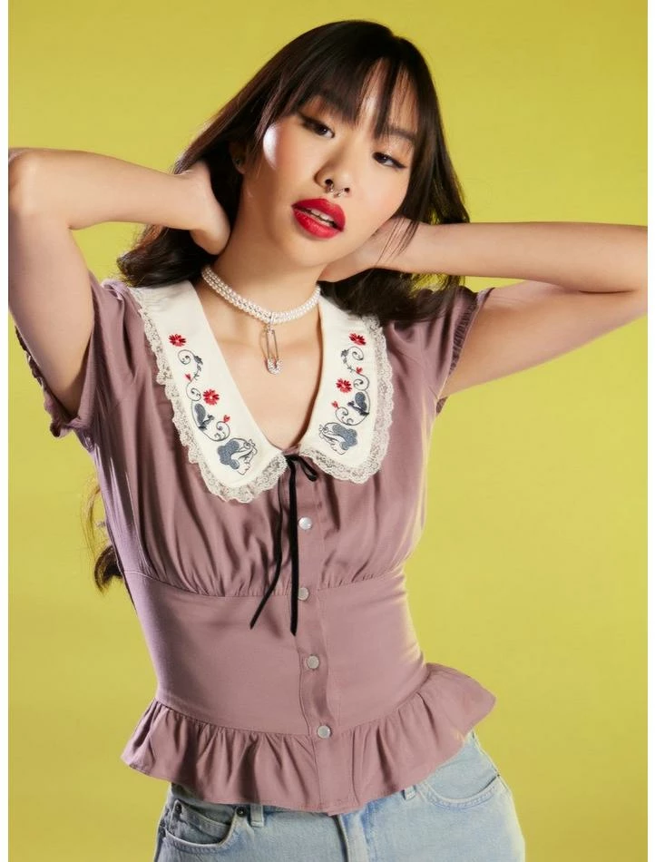 We’re wishing, we’re wishing… for this peasant top! Perfect for those cozy cottage days making gooseberry pie, this woven top from Snow White and the Seven DwarfsΒ is inspired by her peasant dress. Features a contrast peter pan collar with lace trim and embroideries of her silhouette, flora and fauna on the collar, plus her name and an apple embroidered on the back in script font. The top is complete with a smocked panel on the back, buttons down the center and puffy, elasticated sleeves.