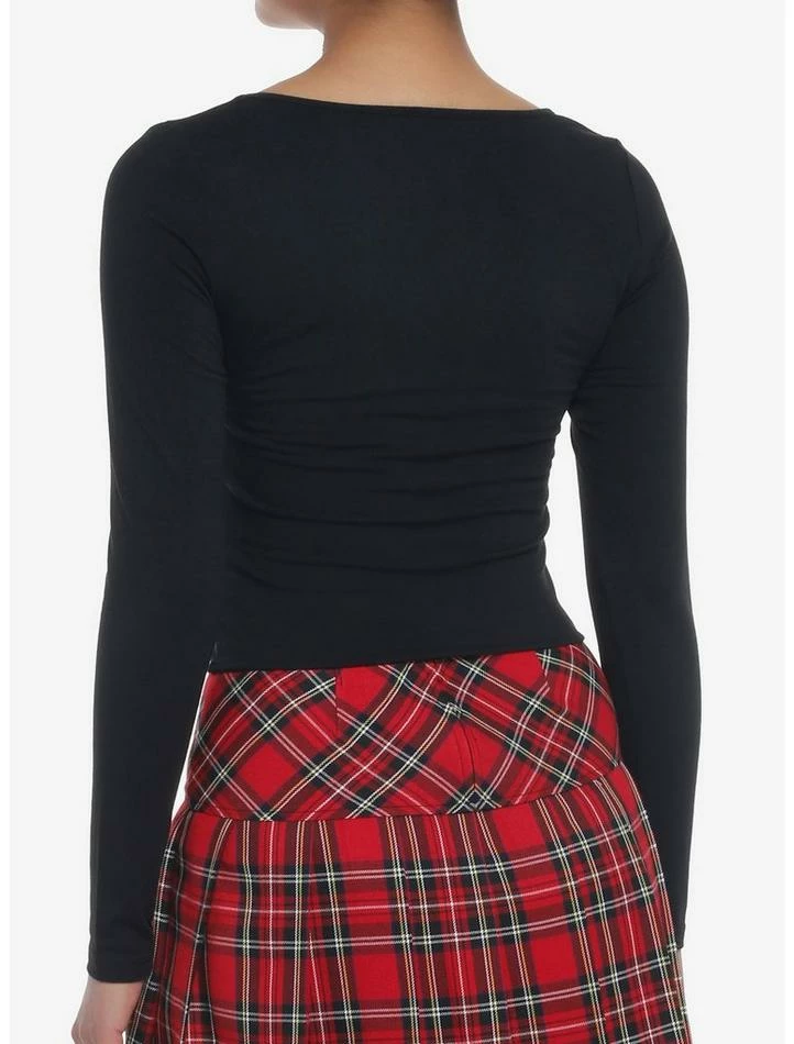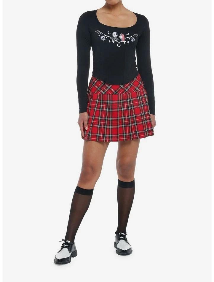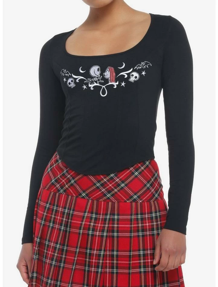 Taking a trip to Halloween Town? Blend in with the locals with this The Nightmare Before Christmas long-sleeve. It has a cropped length with corset-inspired seams and features embroideries at the chest of Jack and Sally with filigree and Halloween icons.