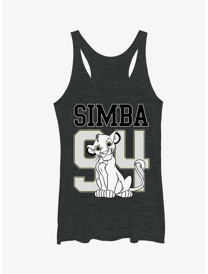 Be on Team Simba with the Lion King Simba 94 Heather Black Racerback Tank Top! A smiling young Simba decorates the front of this black Simba tank top alongside “Simba 94” in athletic style white print to commemorate the animated film’s release in 1994. 50% Polyester, 25% Cotton, 25% Rayon. Designed with raw-edge hems.