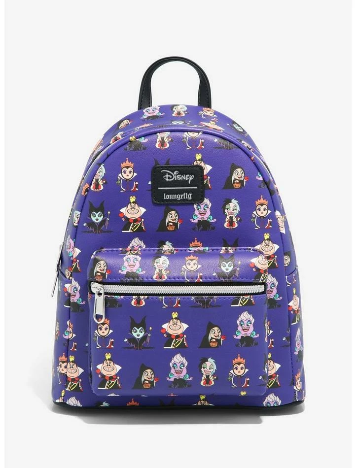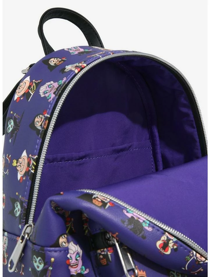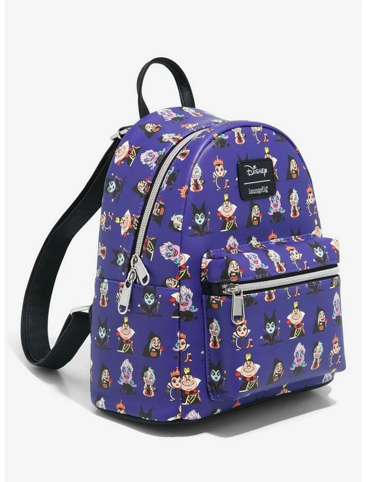 Sometimes it feels good to be bad. Carry around your essentials in a perfectly wicked way! This mini backpack features an all over print highlighting chibi versions of your favorite Disney villains, including Ursula, the Evil Queen, Maleficent and Cruella de Vil! Comes with adjustable straps, front zipper pocket, interior drop pocket and a top carrying handle.