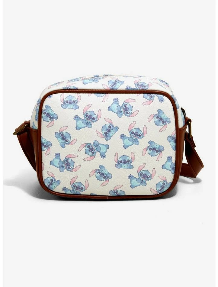 It’s called a camera bag but you can fit so much more in it. This cream faux leather crossbody from Disney and Loungefly features an allover Stitch print and brown trim. Inside has light blue lining and a zipper pocket. Zipper closure.