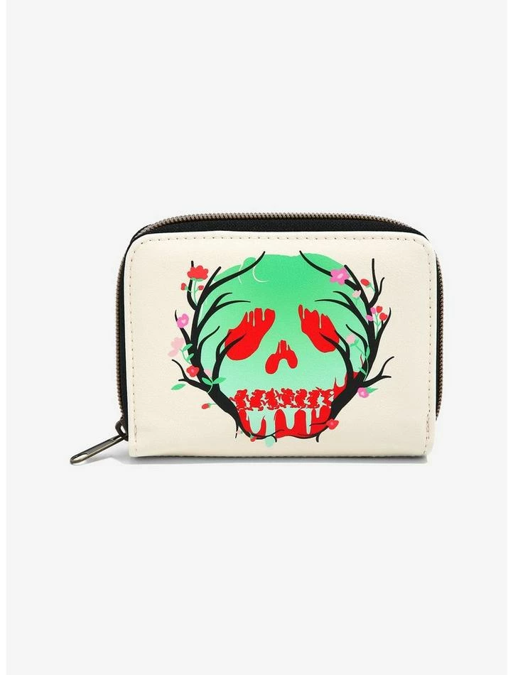 Everyone will stay clear of your cash and cards when in this wallet from Disney featuring a poison apple graphic with branches, flowers and silhouettes of the Seven Dwarfs. Inside has card slots and clear ID display.