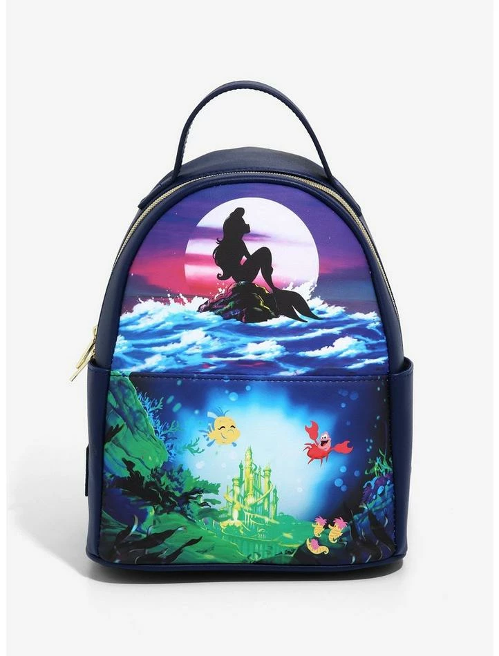 Life might be better under the sea, but you should keep your belongings safely above water with this mini backpack! Inspired by scenes fromΒ The Little Mermaid, this mini backpack is printed with Ariel’s silhouette in front of the moon with Flounder and Sebastian under the sea. Featuring adjustable straps, top carrying handle, top zipper closure, internal pocket and 2 external pockets.