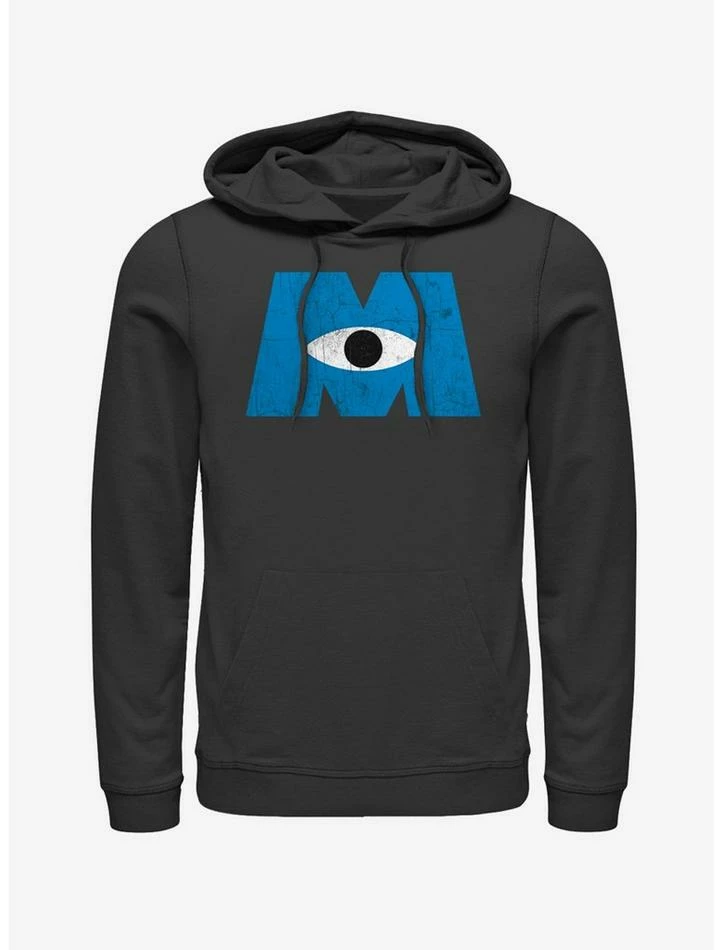 Join your favorite scarers Mike and Sulley with the Monsters Inc Eye Logo Black Lightweight Hoodie! A blue “M” with an eye, also known as the Monsters Inc logo, is printed in a distressed style on the front of this cool black Monsters Inc hoodie. 50% Cotton, 50% Polyester.