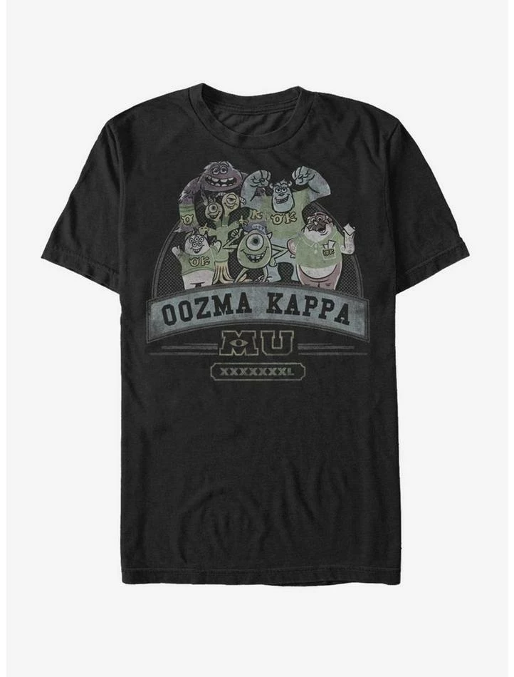 Join your favorite monster frat with the Monsters University Oozma Kappa Black T-Shirt! A distressed print on the front of this funny black Monsters University shirt features the members of Oozma Kappa fraternity including Mike, Sully, Terri, Terry, Art, and more. 100% Cotton.