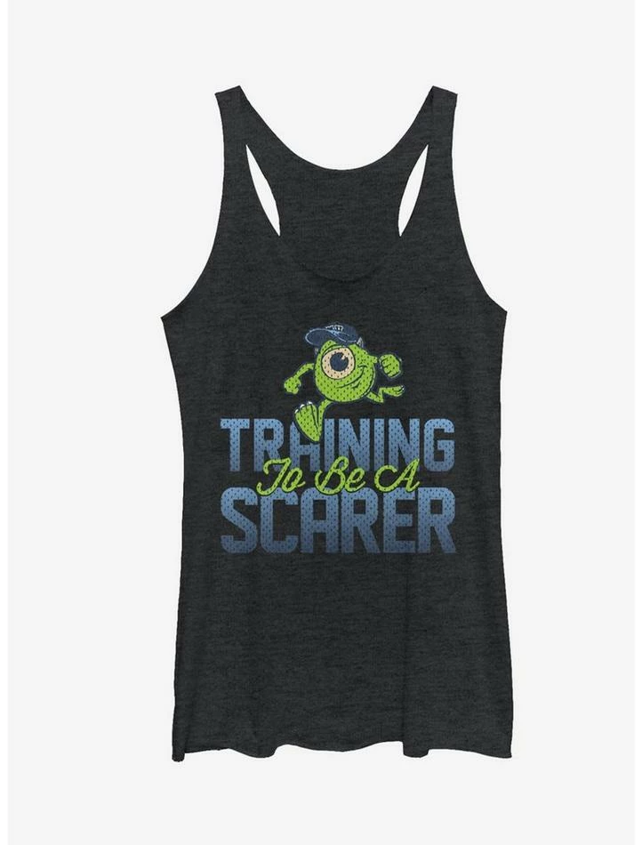 Join your pals Mike and Sully with a little help from the Monsters Inc. Training to be a Scarer Heather Black Racerback Tank Top! Sporty letters spell out “Training to be a Scarer” below Mike Wazowski printed on the front of this cute Monsters Inc. shirt. 50% Polyester, 25% Cotton, 25% Rayon.