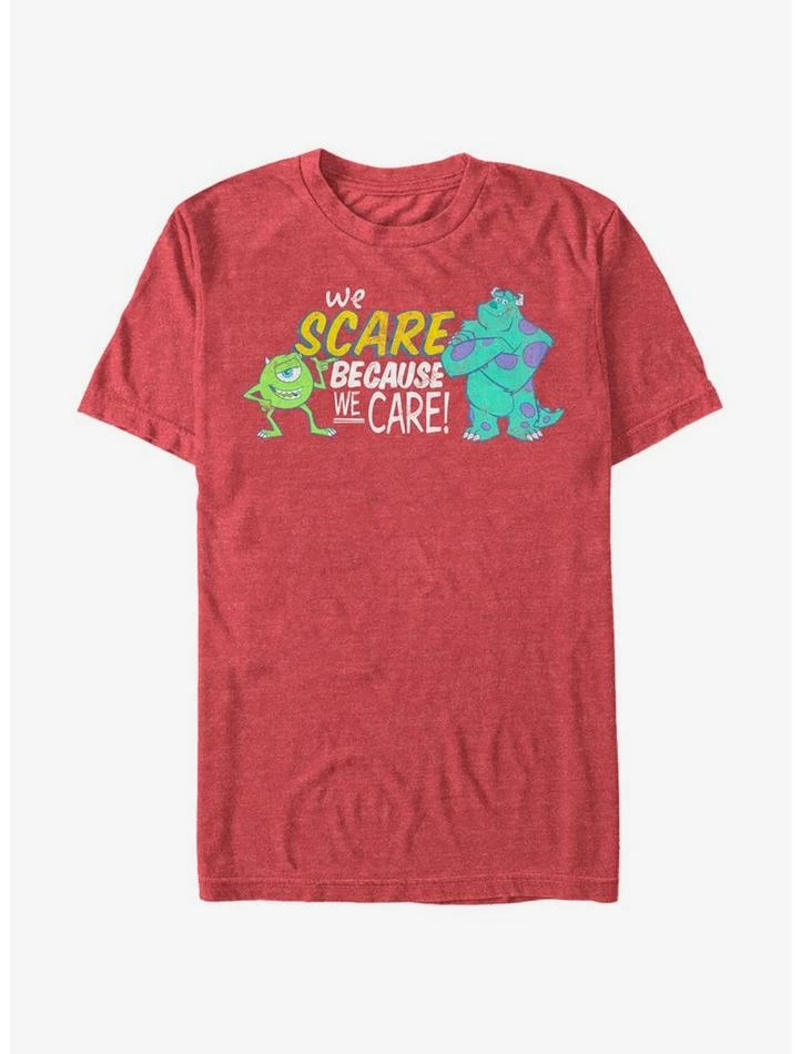 Open your closet door and get ready to visit Monstropolis with the Monsters Inc. We Scare Because We Care Monsters Heather Red T-Shirt. Your two favorite monsters, Mike and Sulley, are portrayed in distressed print alongside the phrase “We Scare Because We Care” on this red Monsters Inc. shirt. 60% Cotton, 40% Polyester.