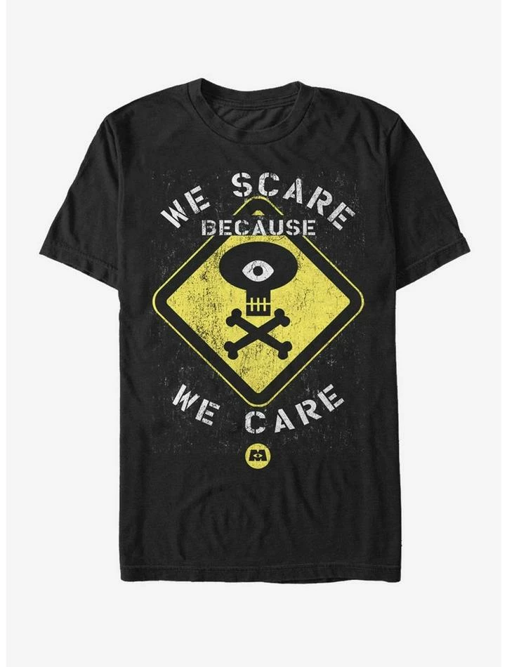 Head to the Monstropolis scream-powered energy plant with the Monsters Inc. We Scare Because We Care Sign Black T-Shirt. A distressed yellow and white print reads “We Scare Because We Care” alongside a warning sign with a one-eyed skull and crossbones symbol on this black Monsters Inc. shirt. 100% Cotton.