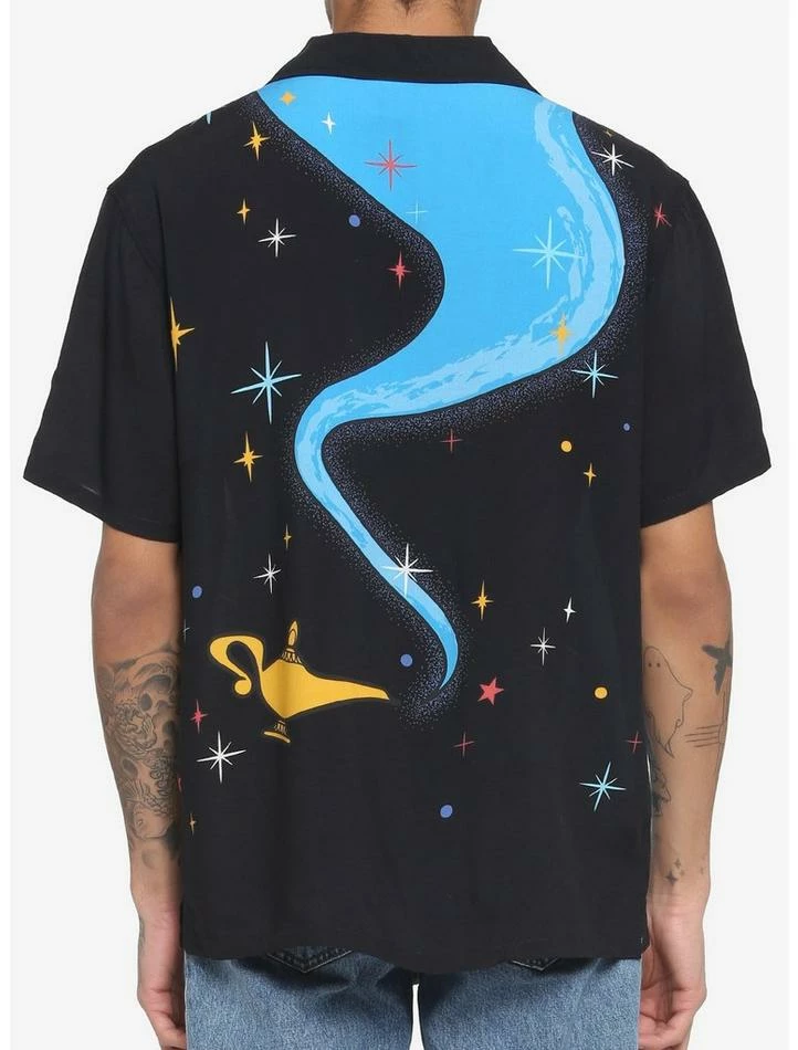 You ain’t never had a friend like Genie, and you ain’t never had a shirt as magical as this one! Celebrate 30 years of Disney’s iconic film, Aladdin, with this woven button-up! Featuring Genie smiling on the front among stars, plus his tail coming out of the lamp on the back with more stars. Complete with a soft collar and buttons down the front.