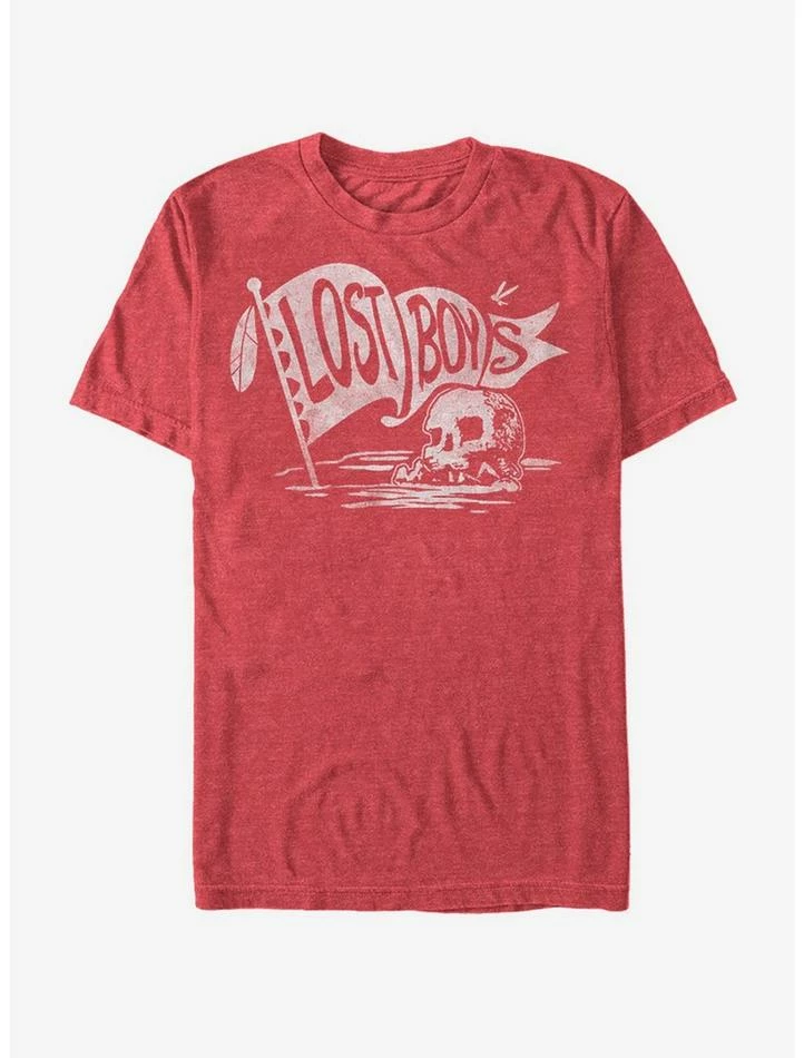 Wear the Disney Peter Pan Lost Boys Flag Heather Red T-Shirt and you never have to grow up! This awesome red Peter Pan shirt shows off a distressed graphic of Skull Rock and a flag that reads “Lost Boys” across the front. 50% Cotton, 50% Polyester.