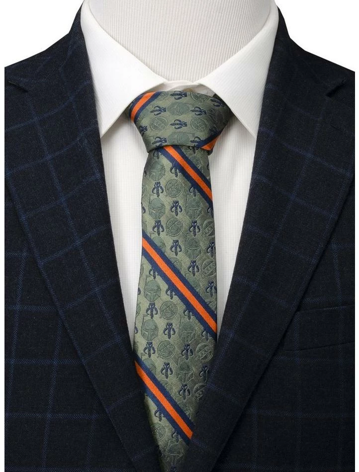 The dot pattern on this tie features Boba Fett’s helmet and the symbol of the bounty hunters in sage green and the sigil for the Mandalorians in navy. A Navy and Orange stripe cuts through the subdued dot design. Made from a Silk and Polyester blend. Officially licensed by LucasFilm LTD.