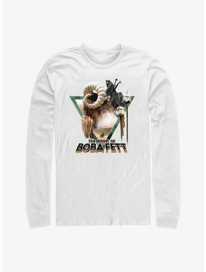 Wish you could ride a bantha? Here’s the next best thing. This long-sleeved white graphic tee — inspired by Chapter 3 of the Disney+ series Star Wars: The Book of Boba Fett — features the legendary bounty hunter atop the iconic beast, as they pass decaying Stormtrooper helmets on pikes in the harsh desert landscapes of Tatooine.