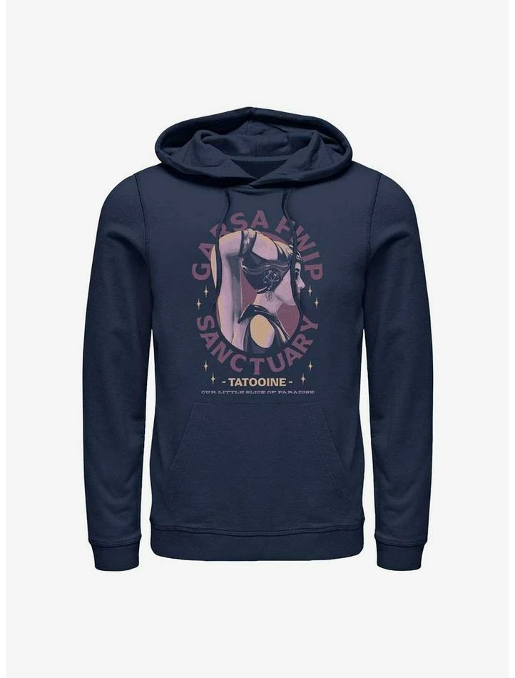 Grab a tall, cool one at the Sanctuary, a Mos Espa cantina owned by Garsa Fwip. This navy blue pullover hoodie — inspired by the Disney+ series Star Wars: The Book of Boba Fett — features an image of the Twi’lek madam herself, with “Tatooine” and “Our little slice of paradise” below.