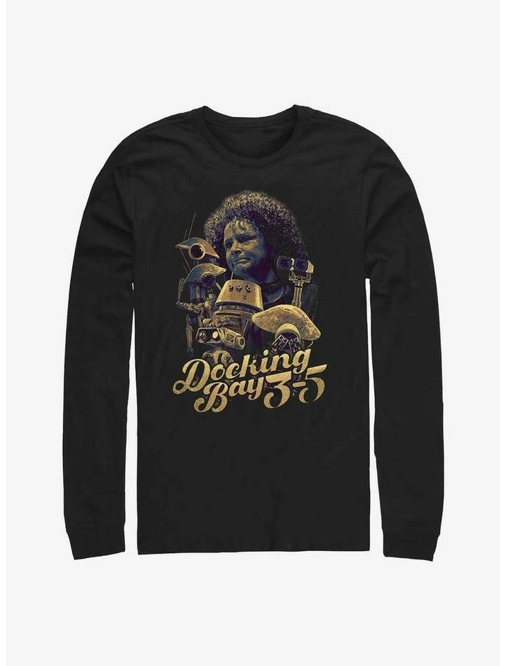 You’ll find all the droids you need at Peli Motto’s shop in Mos Eisley! This long-sleeved black graphic tee — inspired by the Disney+ series Star Wars: The Book of Boba Fett — features all things Docking Bay 3-5.