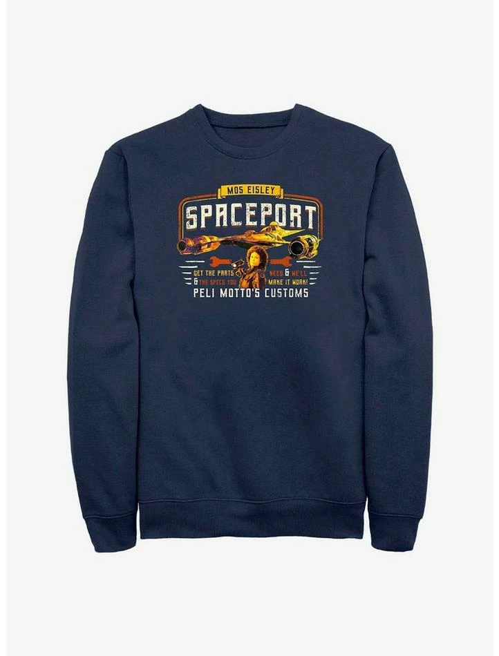 Visit the Mos Eisley Spaceport for all the parts and specs you need! This navy blue crewneck sweatshirt features Peli Motto, the scrappy engineer from Chapter 5 of the Disney+ series Star Wars: The Book of Boba Fett.