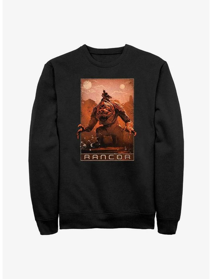 Your other ride is a… rancor. Show ’em how you get around with this black crewneck sweatshirt — inspired by the Disney+ series Star Wars: The Book of Boba Fett — that features the legendary bounty hunter on top of the iconic reptilian beast.