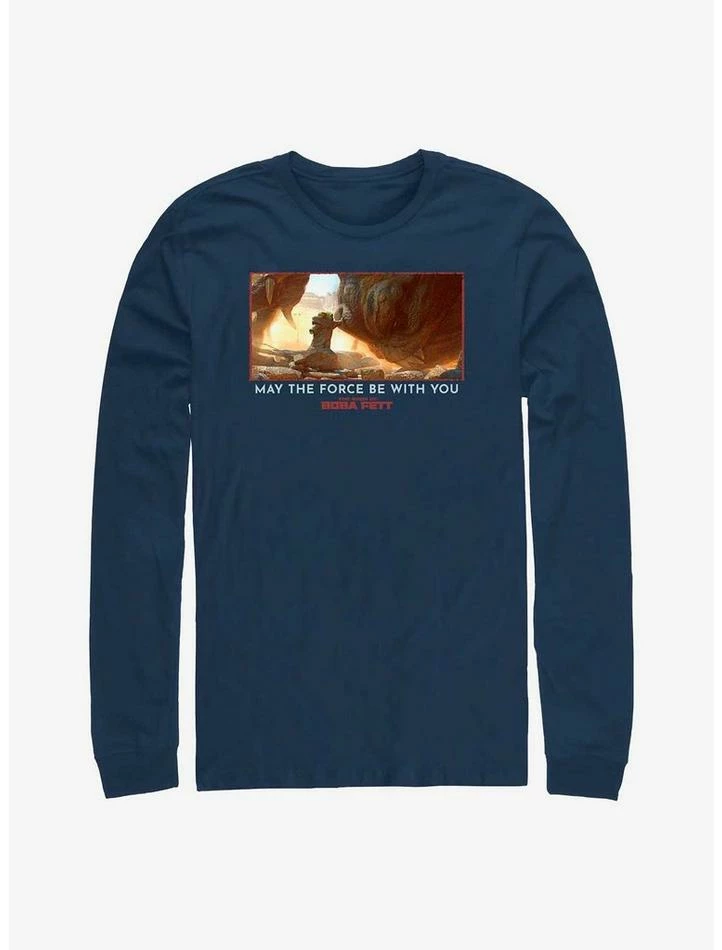 May the Force be with you… when a rancor comes your way! This long-sleeved navy blue graphic tee — inspired by Chapter 7 of the Disney+ series Star Wars: The Book of Boba Fett — features The Child, AKA Grogu, taming the iconic beast.