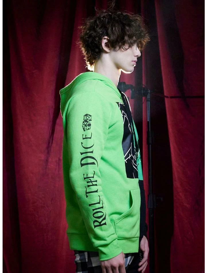 Roll the dice with Oogie Boogie! This hoodie features a split green and black design with graphic of Oogie Boogie on the front, “Roll the dice” on the right sleeve and “Oogie Boogie” on the left sleeve.