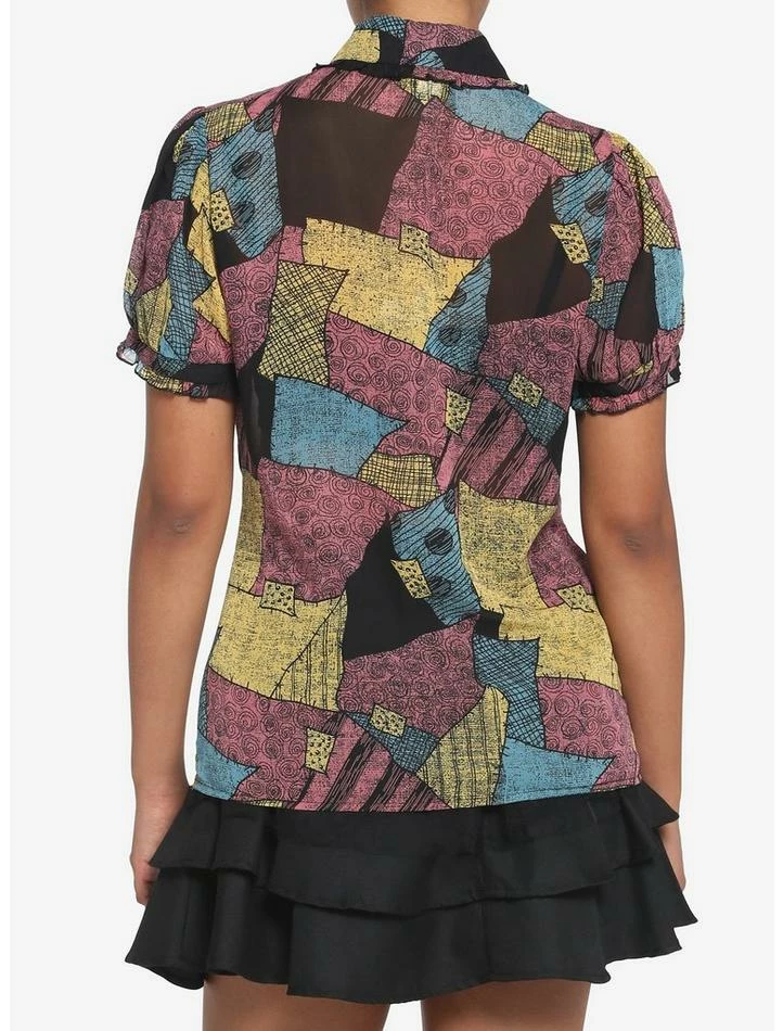Rep Halloween Town’s number one fashionista in this The Nightmare Before Christmas button-up! Inspired by Sally’s dress, this sheer top features an allover patchwork print and puff sleeves. Comes with pleats down the front, Peter Pan collar and a velvet tie-front ribbon.Β