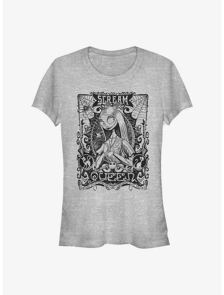 ย We stan our Scream Queen! This fitted, lightweight heather grey graphic tee — inspired by The Nightmare Before Christmas — features Sally in an art nouveau-style design, with spiders, webs, cats… and of course, Jack.
