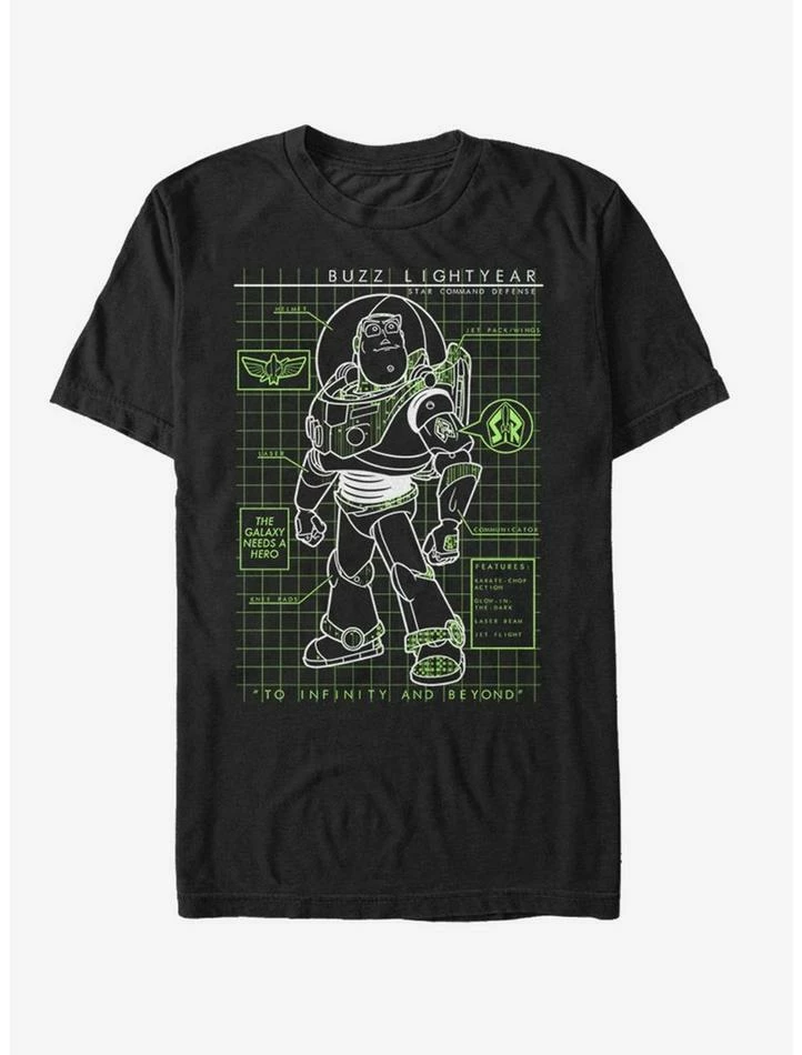 Go to infinity and beyond with the Toy Story Buzz Lightyear Diagram Black T-Shirt! A schematics-style print on the front of this awesome black Toy Story shirt feature Buzz Lightyear with all his features listed in detail including his laser and karate-chop action. 100% Cotton.