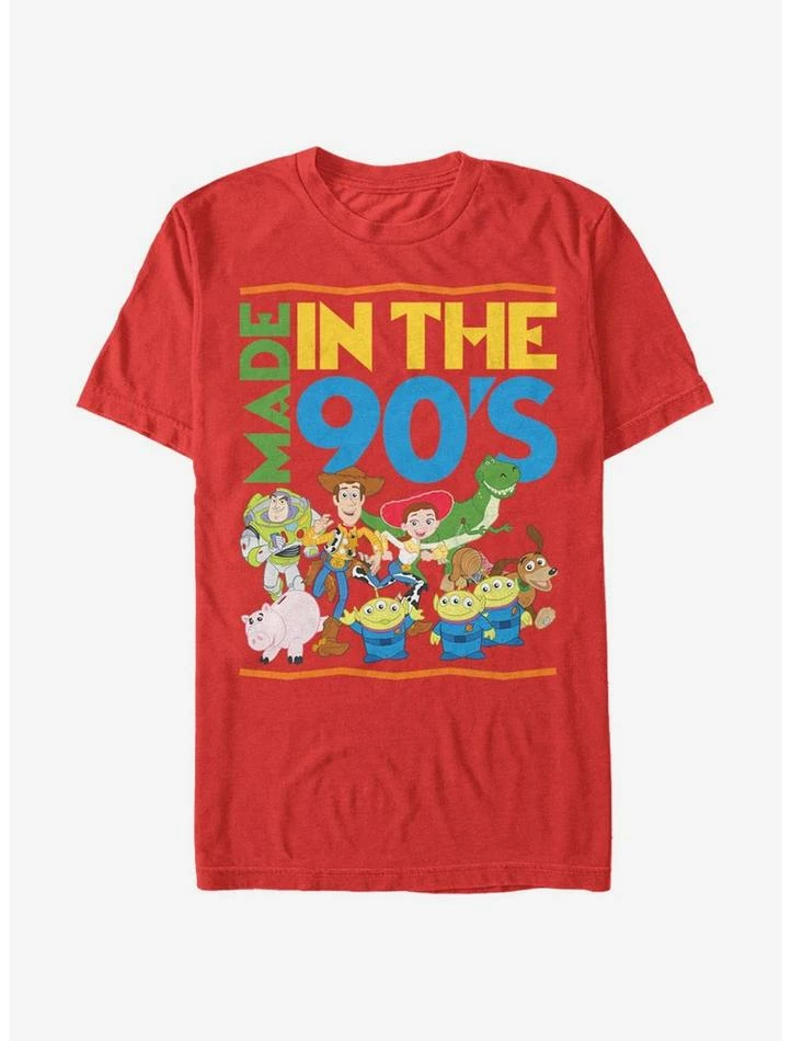 Take a trip down memory lane with the Toy Story Made in the 90’s Red T-Shirt. The phrase “Made in the 90’s” is printed alongside your favorite Toy Story characters Woody, Buzz Lightyear, Hamm, Rex, Slinky Dog, Jessie, and the Squeeze Toy aliens on the front of this cool red Toy Story T-shirt. 100% Cotton.
